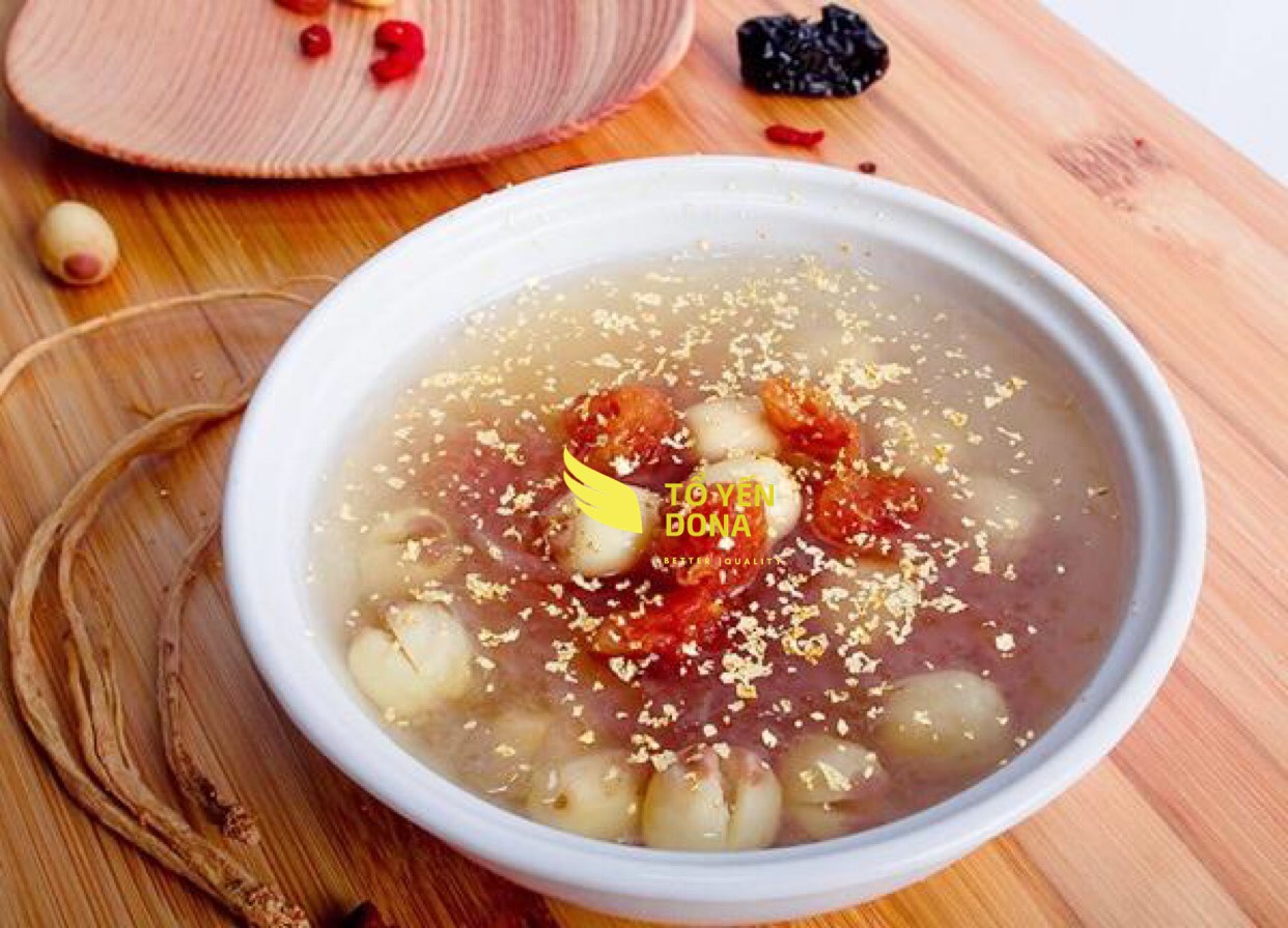 Nguyên liệu: 1 tai yến, 10 hạt sen, 3 hạt bạch quả, 10 trái táo đỏ, 20g đường phèn